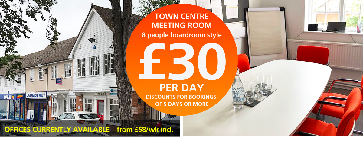 Located in Rowe House, Emson Close, Saffron Walden, Essex, the meeting room is in the centre of the town which includes Costa Coffee (2 minute walk), Starbucks and a huge choice of independent coffee shops, restaurants and public houses.